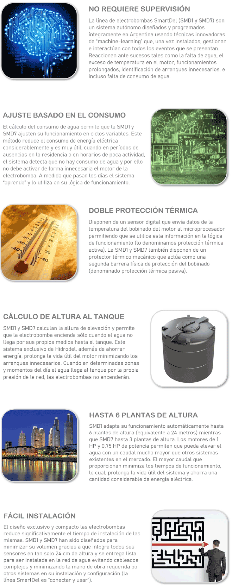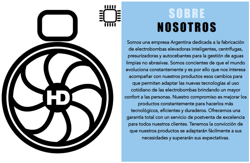 Introduciendo las electrobombas elevadoras inteligentes SmartDel SMD1 y SMD7, ofrecemos una solución innovadora y eficiente para el suministro de agua sin complicaciones. Nuestro sistema de instalación simplificado y sin necesidad de tanques cisterna ni cableados adicionales las convierte en una elección conveniente para cualquier entorno. Al utilizar nuestro revolucionario diseño de voluta y cálculo de elevación (PAT. PEND.), estas electrobombas funcionan de manera automática, activándose únicamente cuando el agua no puede llegar por sí sola al tanque. Esto se traduce en un ahorro significativo de energía en comparación con los métodos tradicionales disponibles en el mercado.. Lo que realmente distingue a nuestra línea de productos SmartDel es su capacidad inteligente de adaptación a los hábitos de consumo de agua. Equipadas con un microprocesador y sensores digitales, estas electrobombas monitorean y administran activamente todos los parámetros telemétricos para optimizar su rendimiento en cualquier ubicación. Además, cuentan con doble protección térmica para garantizar la durabilidad del motor. Confiamos tanto en la calidad de nuestras electrobombas que ofrecemos una garantía de fábrica de 2 años. Estamos seguros de que estas electrobombas inteligentes establecerán un nuevo estándar en el campo de la elevación de aguas limpias no abrasivas, ofreciendo eficiencia, conveniencia y confiabilidad en un solo paquete.